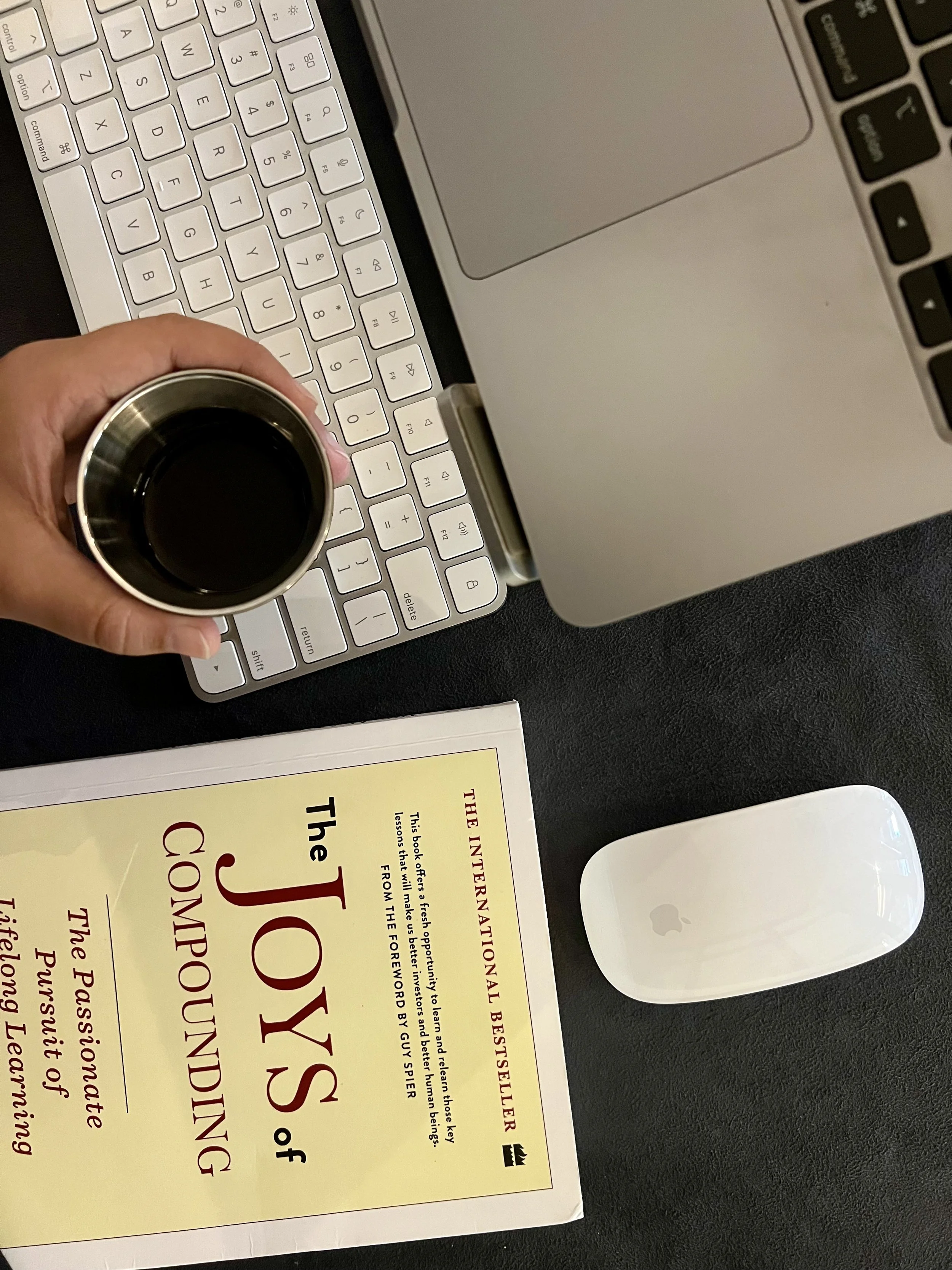 A book titled ‘The Joys of the Compoundings’ lies nearby. VhoraFundz Pune. AMFI-registered Mutual Fund Distributor, registered NJ Wealth Partner.